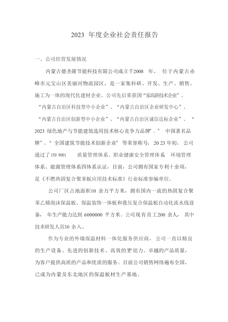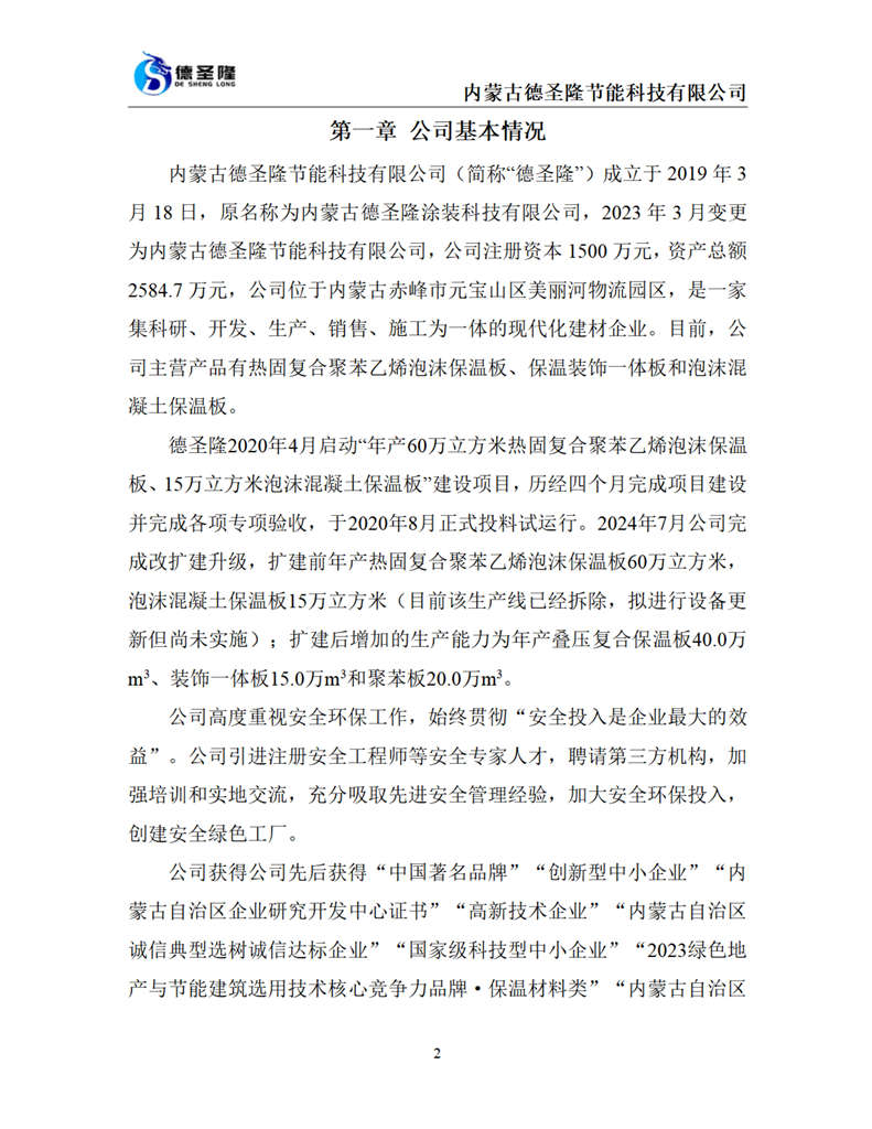 內蒙古德圣隆節(jié)能科技有限公司成立于2019年,位于內蒙古赤峰市元寶山區美麗河鎮物流園區,是一家集科研、開發(fā)、生產、銷售、施工為一體的現代化建材企業。公司主營產品:熱固復合聚苯乙烯泡沫保溫板、保溫裝飾一體板和泡沫混凝土保溫板,年生產能力達到6000000平方米。